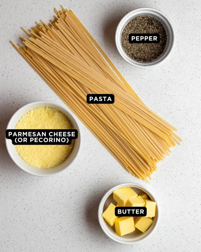 Authentic cacio e pepe contains only pasta, Pecorino Romano, black pepper, and pasta water. Adding cream changes the structure and flavor.