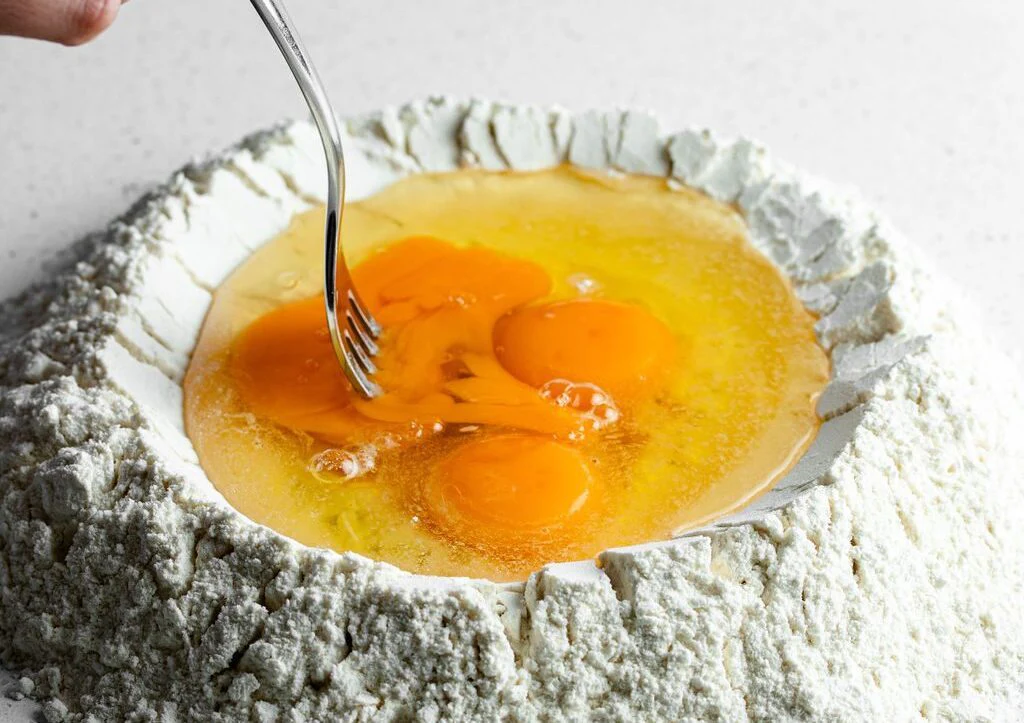 • Beat the eggs gently with a fork, slowly incorporating flour from the edges
